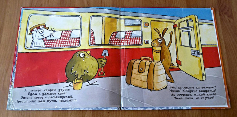 На картинках сын все время следит за птичкой и очень ждет разворот, на котором она будет спать. Что-то в зрелище спящей птицы его сильно забавляет. А надо сказать, что звери постоянно меняются местами: то он проводник, то машинист, то стрелочник. Сын зорко следит кто, когда и на чем едет.