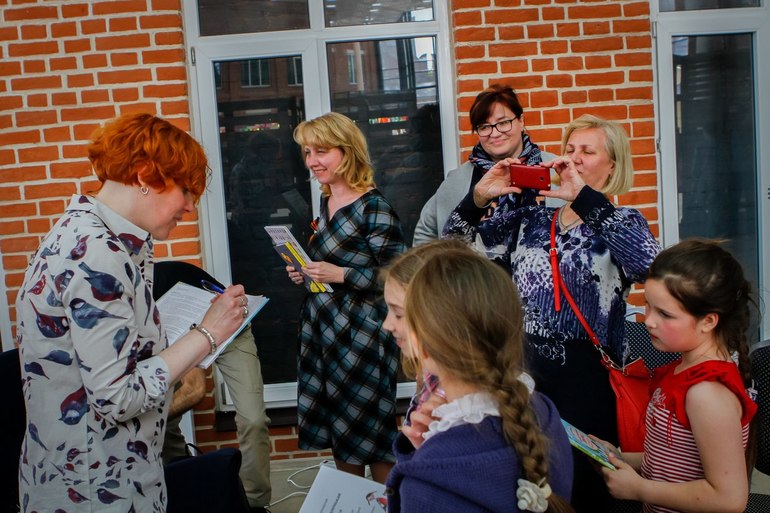 Мария рассказала о серии книг про большую маленькую девочку, немного о себе и своей работе( она учитель литературы в одной из частных школ в Минске). Сейчас она пишет новую книгу. А про Женю(героиню "Большой маленькой девочки"), возможно, еще напишет(присутствовавшие на встрече дети очень ее об этом просили). Но это будет уже совсем другая история. Это будет книга про девочку-подростка лет 13 и про ее друга. Потому что Марии самой интересно, как же будут развиваться их отношения.