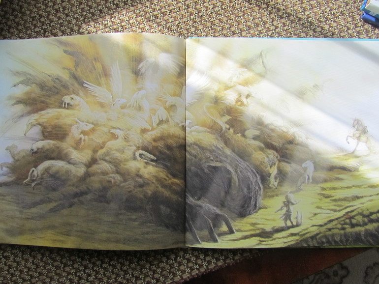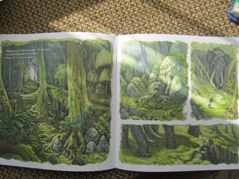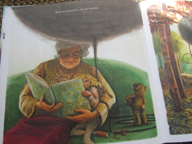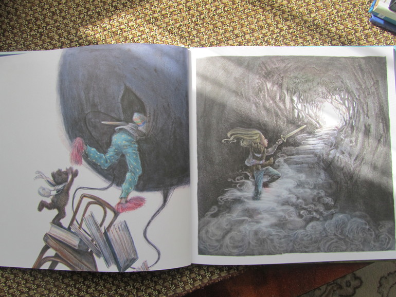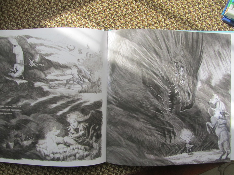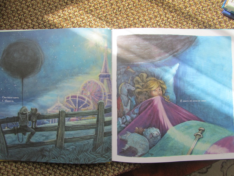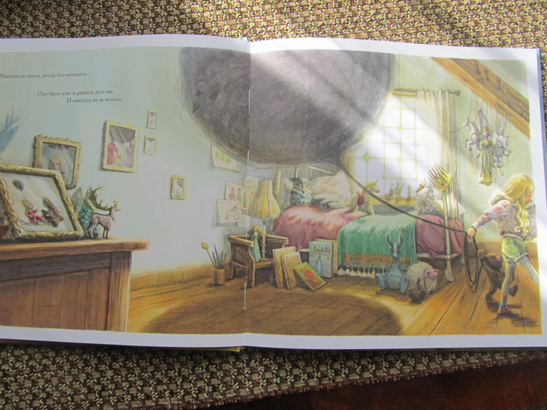 Книга очень красивая, рисунки действительно фантастичные, такие как наверное и должны выглядеть фантазии детей - страшные и наоборот самые положительные. Книга по сути книга-картинка, коих сейчас на книжном рынке очень много, но эта книга не для малышей. Она под собой имеет очень глубинный смысл, он рассказывает о страхах детей и способах бороться с ними, не закрывать глаза на них или смириться, а принять действительность, посмотреть на свой страх прямо в лицо широко раскрытыми глазами и тогда может оказаться, что, то чего ты так боялся на самом деле, не так уж страшно.