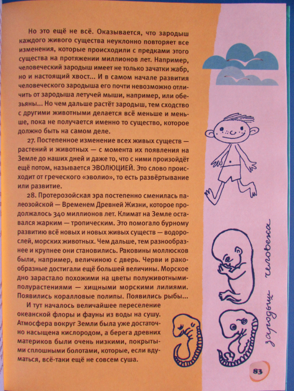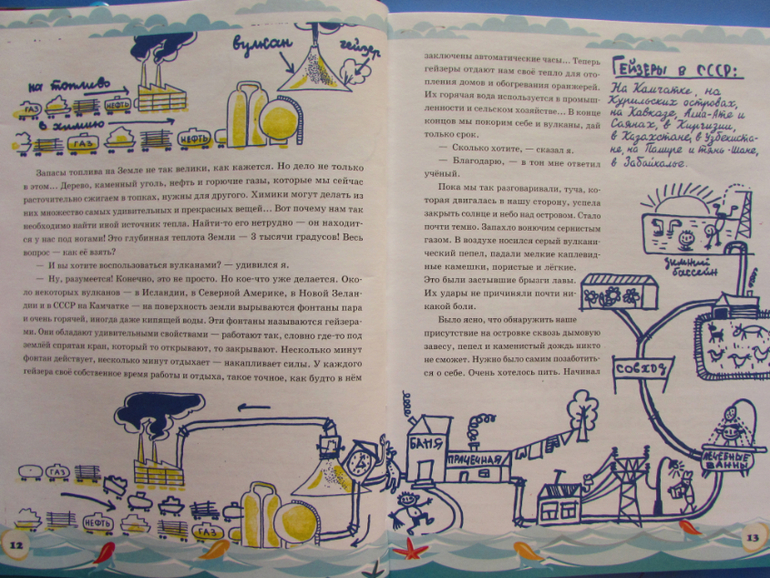 Есть развороты, где текст идет на фоне рисунка. Есть страницы, стилизованные под комикс. А страницы научной тетради оформлены вообще по другому - с полями и сносками.