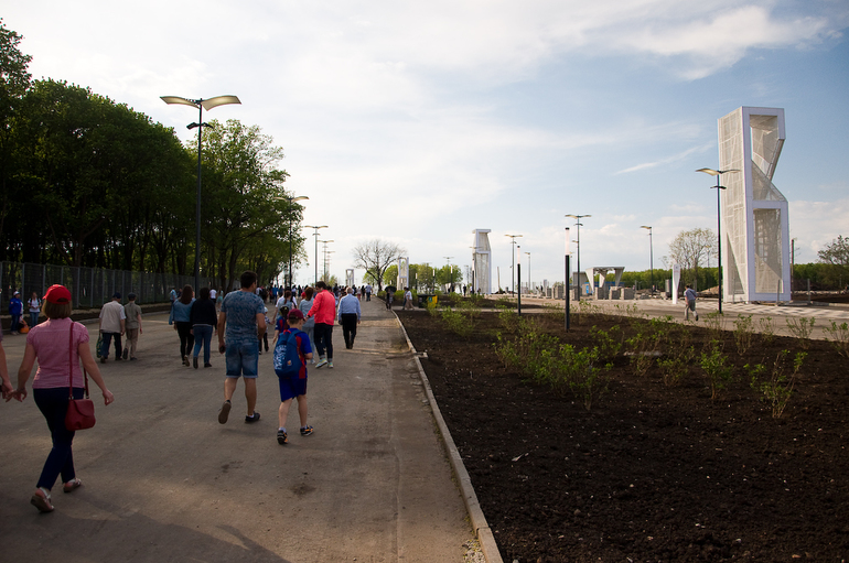 Кругом туча волонтеров, все радуются, смеются. репетируют, одним словом)) Идти к стадиону далеко. Эти колонны оказались цифрами, которые показывают нам сколько осталось пехать. Я сразу и не поняла этого, потом в интернете прочитала.