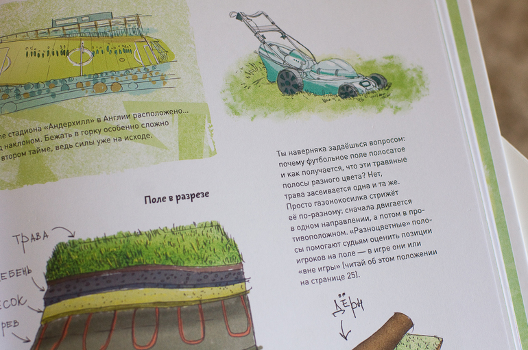 Иллюстрации в книге все рисованные, акварельные, это немного удаляет нас о реальности и добавляет приятной идеальности моему нелюбимому виду спорта. Да, футбол я не люблю. По мне хоккей смотреть все же интересней))