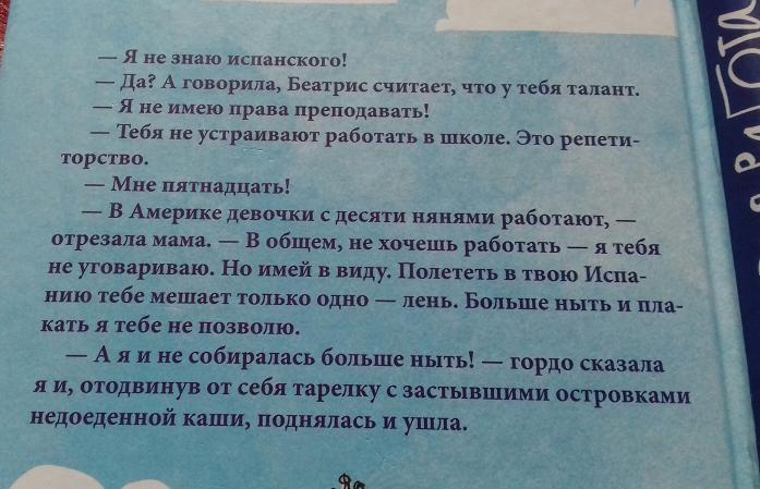Гораздо лучше начинает Маша понимать своих учителей, когда сама оказывается по их сторону баррикады. По-другому складываются и отношения с родителями, со многими одноклассниками. В книге много всего, сюжет дальше рассказывать не буду. Скажу только про конец. Все-таки Маша набрала денег на поездку и поехала в Испанию( хотя сомнения в этом оставались до самого конца)). Но об этом уже во второй книге.