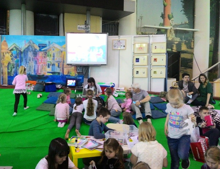 Вообще в этом году мне понравилось на площадке больше. И дочке, по-моему, тоже :))) Было много мероприятий для детей разного возраста: и авторов послушать, и с художниками порисовать, и просто повырезать маску какую-нибудь. Можно было посмотреть-почитать библиотечные книги, в т.ч. редкие.