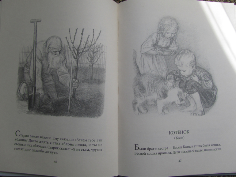 Очень нравится тандем Толстого и Пахомова - короткие понятные рассказы и карандашные реалистичные зарисовки ))