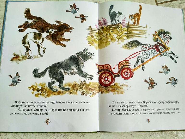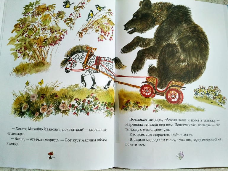 Нравится что каждое действие и каждый предмет прорисован, Даше нравится искать животных по тексту. Особенно она переживает когда лошадка медведя везёт, тяжёлый он!!