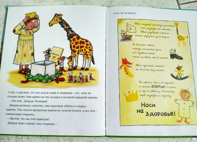 Когда в городе наконец открылся магазин одежды для великанов, Джордж отправился туда и приоделся. Но долго модничать ему не пришлось, слишком добрым и внимательным он был. Заметив грустного Жирафа, Джордж отдал ему свой галстук, что бы не мерзла шея.