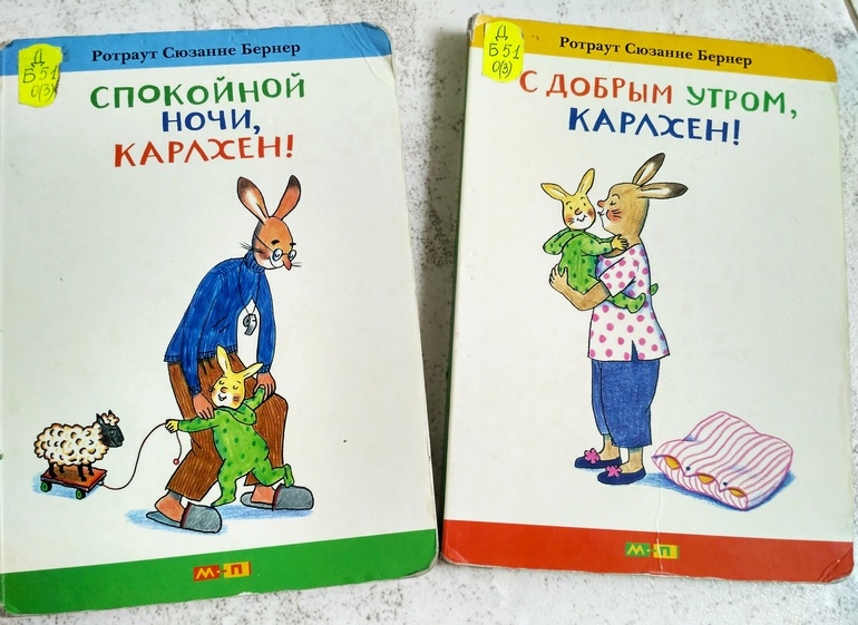 Совершенно не затейливые истории о режимных моментах - пробуждении и укладывании спать. Но даже такие простые вещи можно обыграть. Утром Карлхен прячется под одеяло и мама постепенно это одеяло стягивает, обнаруживая вместо своего малыша мягкого друга..