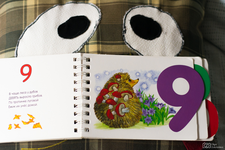 Цифры (Ранок). На удивление большой популярностью пользовалась книжка в своё время, даже по лестнице спускаясь, дочка считала ступеньки так "гусь один идет гулять … пять котят молока хотят .." (это позже, конечно, в 1,10 уже).