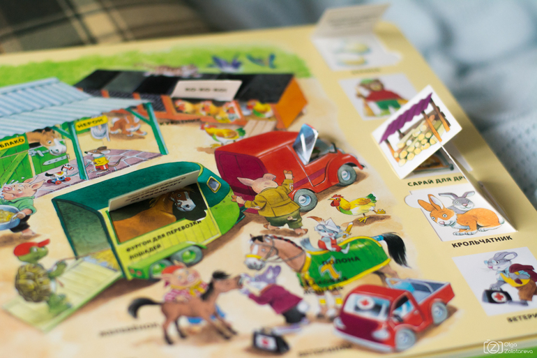 Во-первых, На ферме. 100 окошек (Эксмо). У меня самой непростые отношения с этой книгой (личные заморочки, касающиеся того, что животные тут выступают и в роли собственно животных на ферме и одновременно в роли людей: фермеров, садоводов и пр.). Но дочку, похоже, не смущает эта неразбериха, она любит эту книжку и с родителями обсуждать, и сама листать. Интерес расцвёл, правда, не в полтора, а ближе к 1,9.