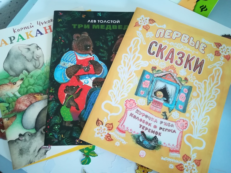 Начинали читать мы сразу с "глобального" "Айболита" и Мойдодыра", а сказки для малышей как-то упустили. На фоне проснувшегося интереса были куплены" Первые сказки " с замечательными иллюстрациями Васнецова и" Три медведя". Читаем часто, едут к нам ещё" Кот, петух и лиса".