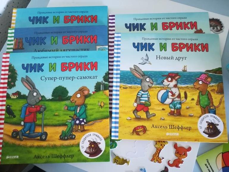 "Лето" и книга от Улыбки тоже периодически достаются с полки, причём первая и на более старший возраст хороша, племянник в 4 года хорошо слушал и смотрел. Есть у нас и "Найди и покажи" с Чиком и Брики - она хороша буквально на месяц, мне кажется, потом надоедает, слишком просто. Плюс иллюстрации дублируют основные книги. Можно было не покупать, ну да ладно - у нас братик и сестричка двоюродные младше - будет подарок))