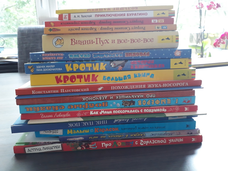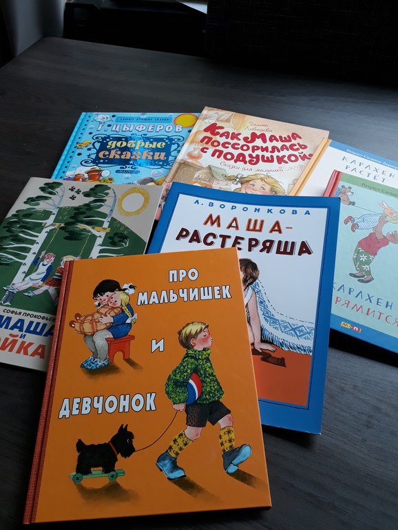 Несколько воспитательных книг: про мальчишек и девчонок (сборник стихов), маша-растеряша, Маша и Ойка, как Маша поссорилась с подушкой, сказки цыферова, серия Карлхена (пользуется огромным успехом), Карасик Носова.