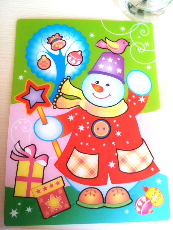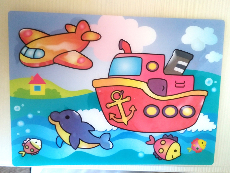 Раскраска чуть меньше тетрадного листа, гладкая, плотная, из пластика. Часть картинки цветная, другая часть белая, и при контакте с водой окрашивается в "нужный" цвет.