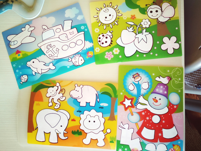 Зато старший (3 года) с удовольствием взялся за дело. После отзывов на лабиринте, взяла 4 шт сразу, т.к выдавать по 1 - мало, а несколько за раз - ребенок и до получаса "творить" может. Единственное, кисть в комплекте мне не понравилась, она царапает рисунок. Мы заменили на нашу обыкновенную и все стало хорошо.