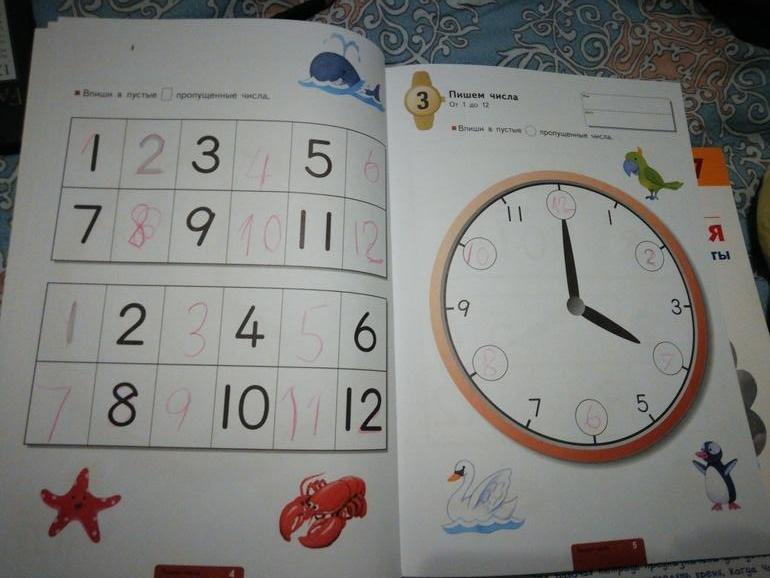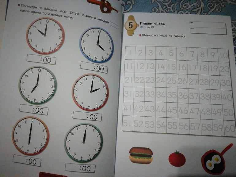 В первой тетрали ненавязчиво ребенок знакомится с цифрами от 1 до 12, пишет их в циферблат и потом учится определять час и полчаса.