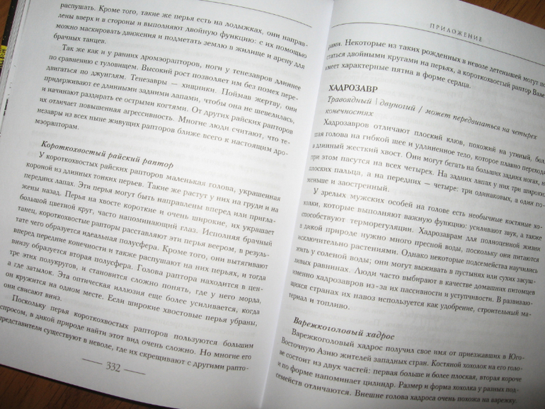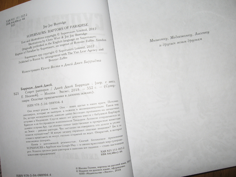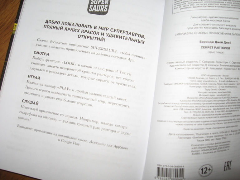 Обложки некоторых книг порой так цепляют взгляд, что пройти мимо просто невозможно. Вот и рапторы цепляли-цепляли и зацепили. Хотя книгу приобрела не для себя, а в подарок для племянника (нам-то рановато немного), но, полистав-почитав, решила, что нам такую нужно тоже. Во-первых, увлекательный сюжет в книге безусловно есть. Язык может и простоват, но витиеватые фразы в приключенческих романах только мешают, ведь хочется скорее узнать что же там за очередным поворотом сюжета, а тут вдруг сюрприз) А тут еще и на современных подростков рассчитана книга. Во-вторых, в книге очень много интересных иллюстраций. Они хоть и черно-белые, но их все равно интересно разглядывать. Есть даже полностраничные развороты. В-третьих, в книге есть дополнительная реальность, хоть нам это и не особо важно, поскольку у Егора нет гаджетов вообще. Окулист нам категорически не рекомендовал такие излишества ввиду того, что запаса прочности у глаз нет совсем. Но немножечко можно и с маминого/папиного посмотреть живые картинки. Ожившие иллюстрации сопровождаются звуком. Голоса героев не русифицированы, но это уж не критично. А еще на обложке присутствует информация, что в приложении можно пройти увлекательный квест (как раз для племянника, он с играми компьютерными "на ты" в отличие от нас). Приложение бесплатное, доступно для AppStore и Google Play.