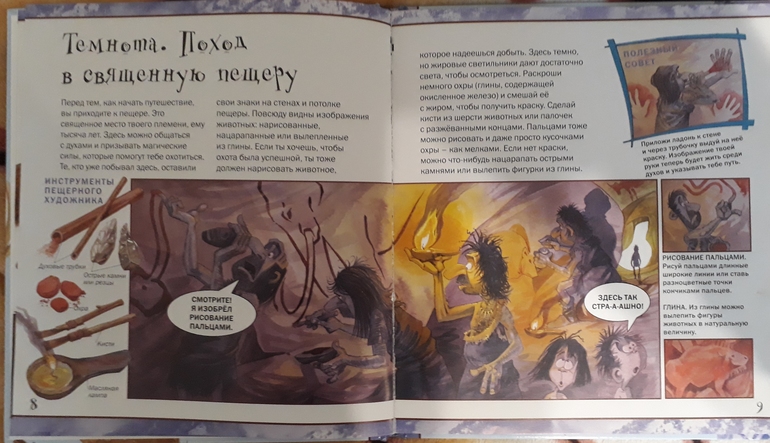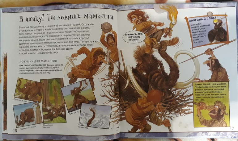 Хоть и стоит на книге маркировка7+, но все же, и в семь лет смотреть на кишки или на картинки, где пробивают голову, или обмазываются навозом мамонта у меня лично вызывает негодование. Из плюсов книги могу отметить следующее: идея, словарь в конце книги,