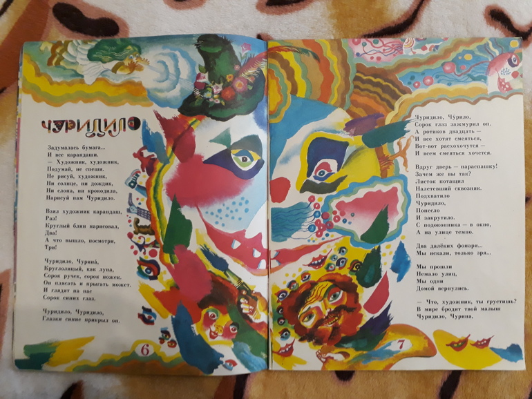 Когда увидела книгу в сообществе, мне она показалась слишком яркой, ляпистой, и что за чудо-юдо на обложке, да и название?! А увидев в библиотеке взяла эту книжицу (иллюстрации не такие яркие, да и интересно стало, что такого в этой книжке, раз ее так хвалят). Книга 1991 года на скрепке, в обложке толщиной, как и все остальные страницы. Надо сказать, что мы с дочкой с Генрихом Сапгиром не были знакомы до этого. Итак, что же Оля…. а Оля выбрала из стопки библиотечных книг эту одну из первых и…. и залипла на этой книге, на дня три точно (ничего другого просто не читали). Самые любимые стихи у Оли: Мигуны и Чихуны, несомненно Чуридило, Сорванцы и Птица-дудочка. А что же я…. а я вообще после первого прочтения не поняла ничего, более того в голове пролетела мысль «это вообще что?», но к концу первого дня я начала наслаждаться невообразимым, красочным танцем слов, рифмы и просто кайфовать вместе с дочкой! «Чуридило» знаем наизусть обе!