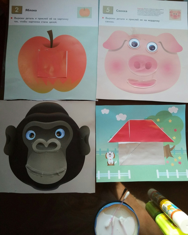 Я не зря в самом начале сказала про мультики, да и вообще про телевизор. Стараюсь, чтобы этого было дозированно, но легко контролировать дома, а когда на даче, взрослые племянники, со своими гаджетами, все выходит из под контроля) Понятно, что можно воспользоваться своим правом вето и наложить запрет на игры и мультики в неограниченном количестве, но злой теткой быть не хочется) поэтому стараюсь их занять, чтоб всем было интересно и весело) и вот насчет этого пособия у меня были переживания) моему то все за радость, аппликации он очень любит, пусть и большую часть вырезаю я, а вот племянникам могло оказаться скучно, возраст то постарше, чем на пособии. Но нечуть не бывало) Вырезали, клеили и радовались, что сделали подарки маме и папе. И на следующий день просили еще)