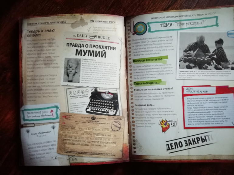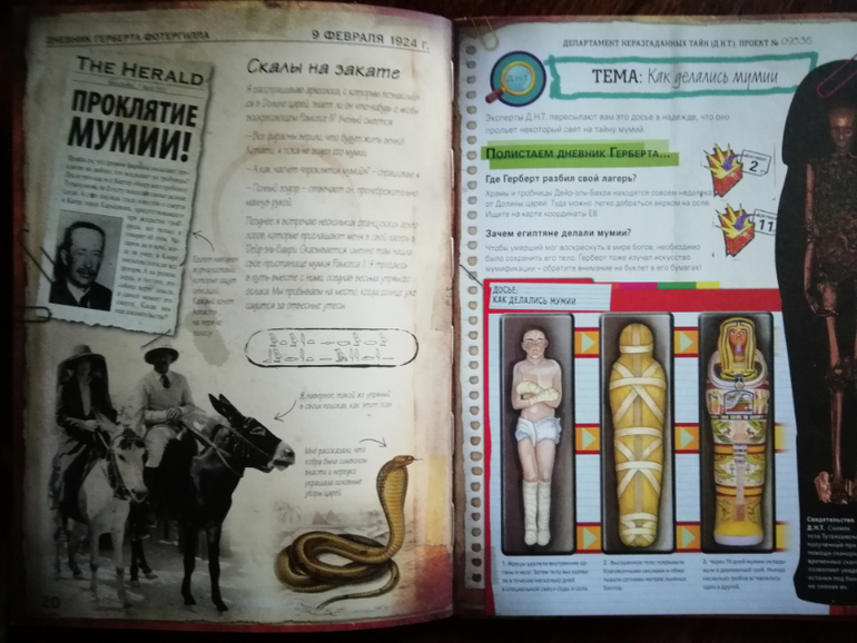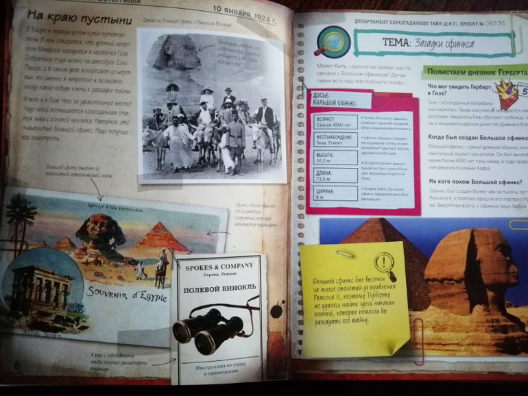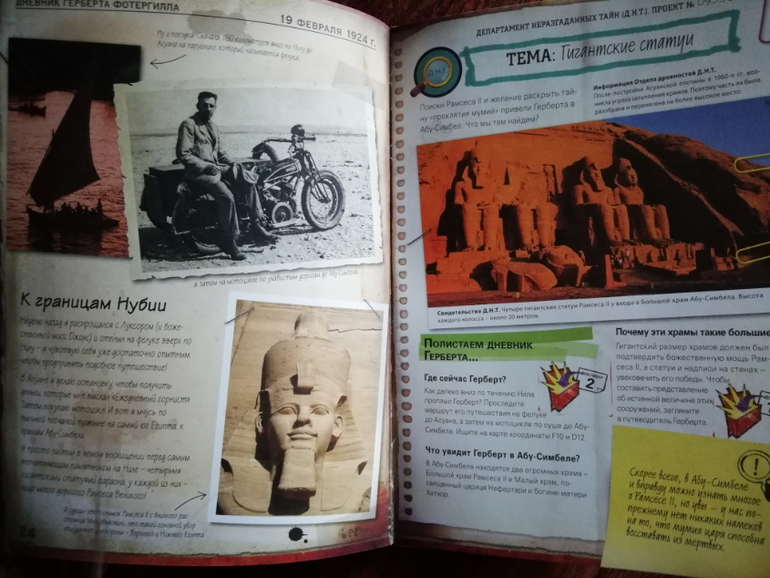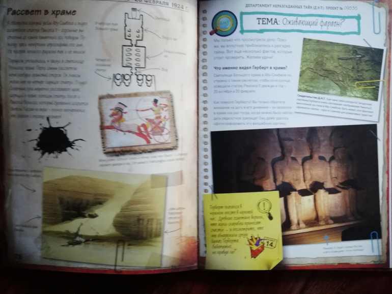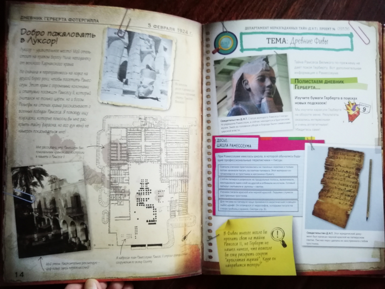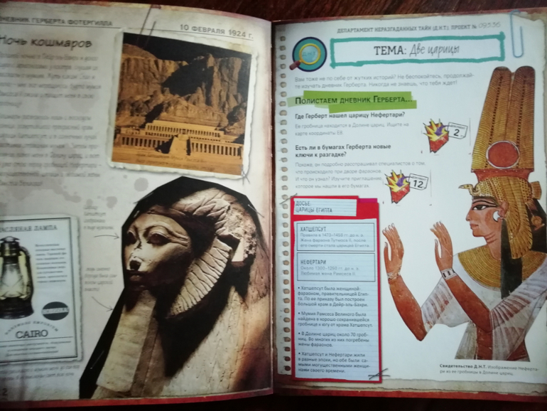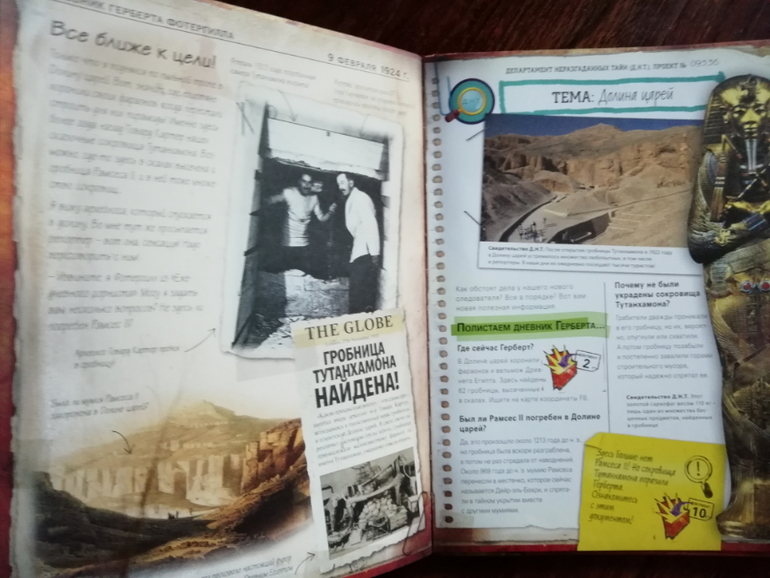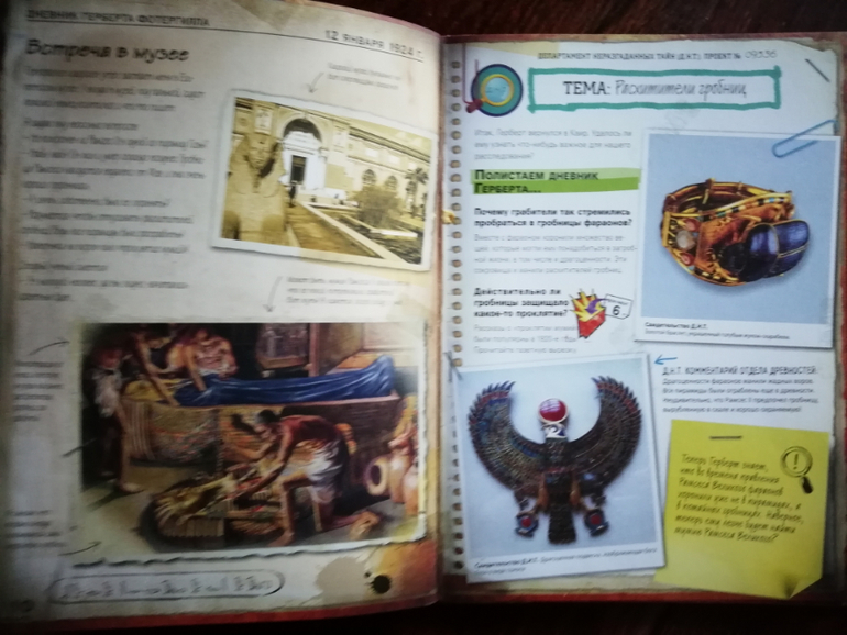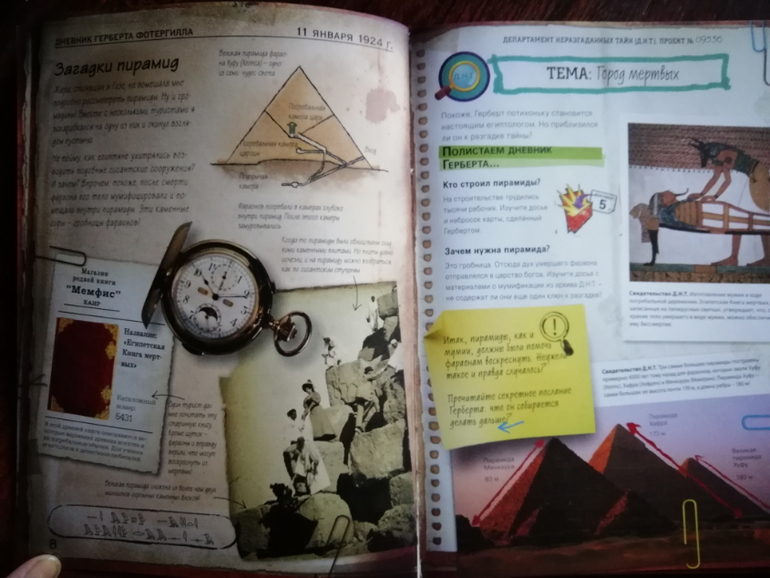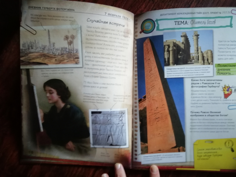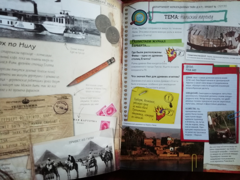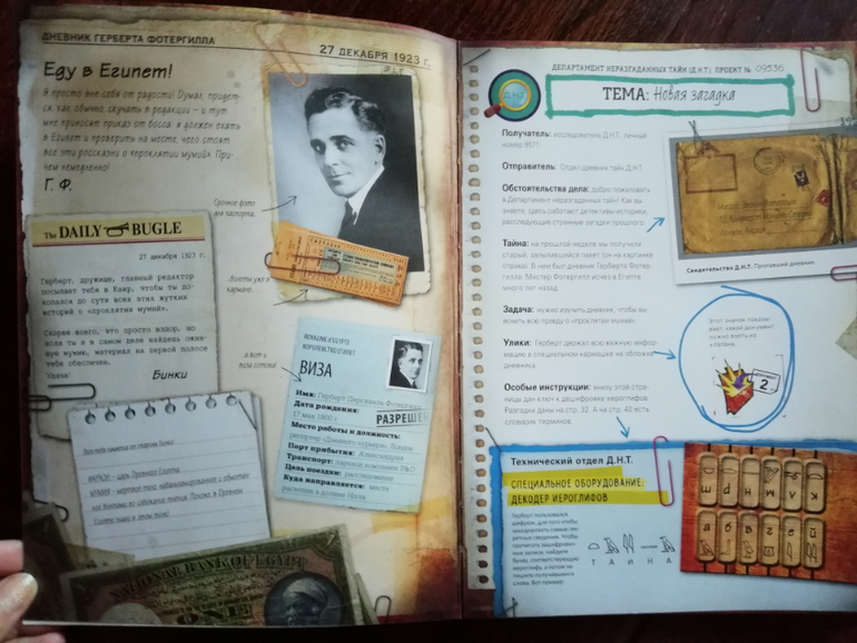 В самом дневнике страничка с записями Герберта и задание для нашего сыщика. Задания интересные, по ходу их выполнения мы узнаем много новой информации о Египте, рассматриваем вложения из конверта.