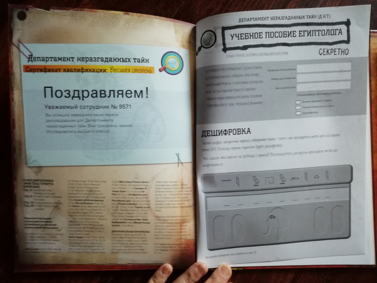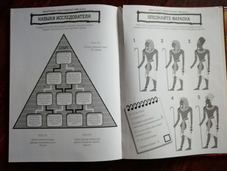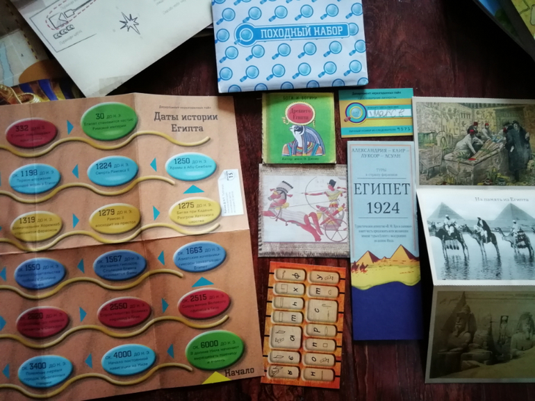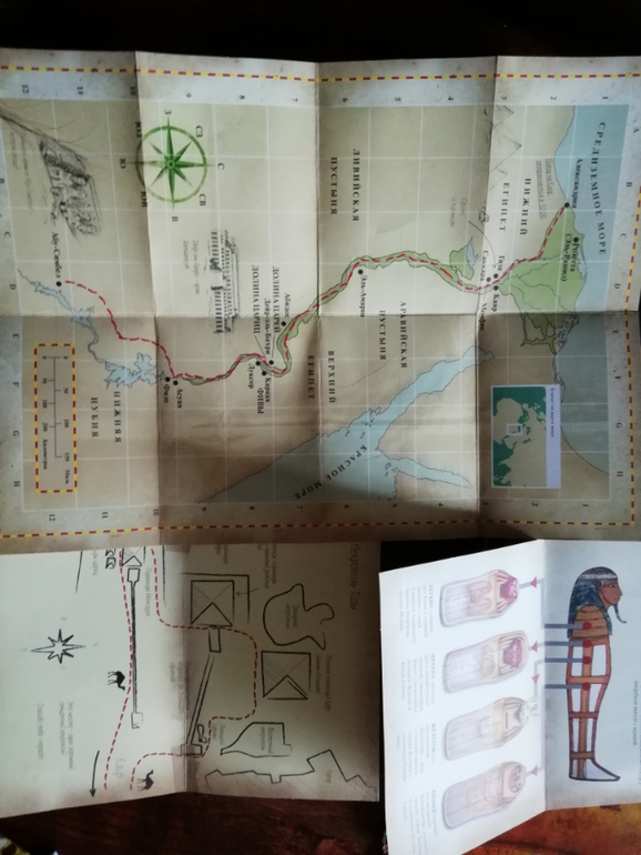 В конверте: маска фараона, конверт с походным набором, карта Египта, разные книжечки и открытки. Причем у каждого вложения есть свой номер, к ним мы будем обращаться по мере прохождения квеста из дневника.