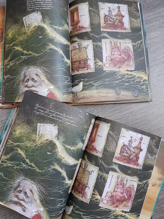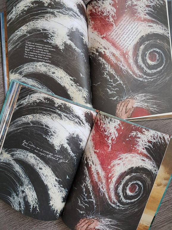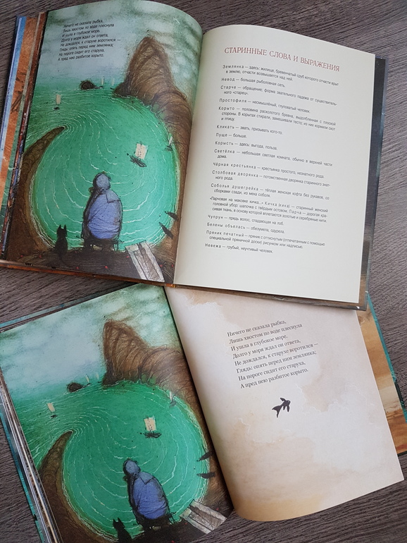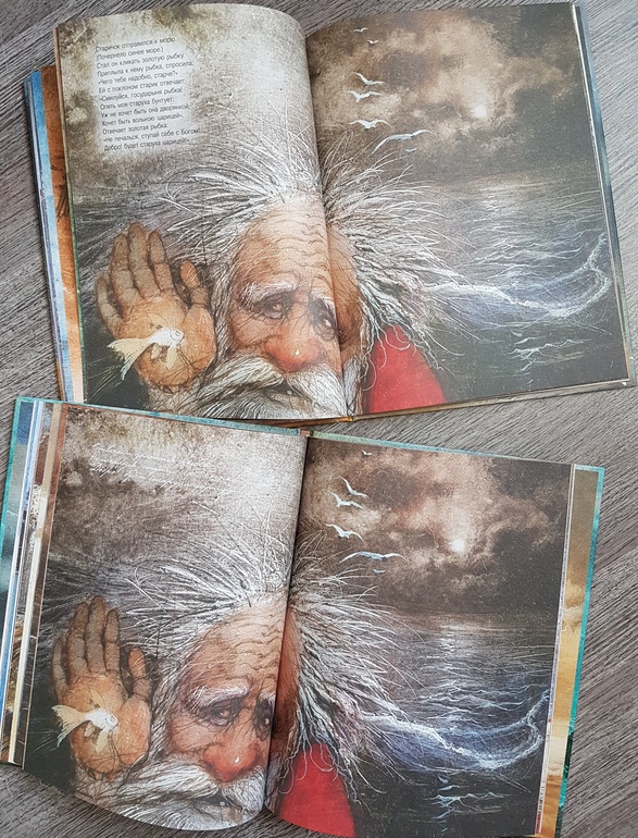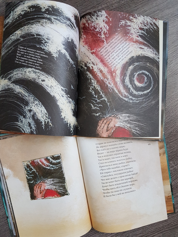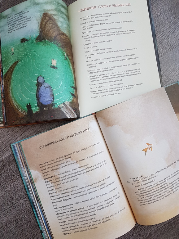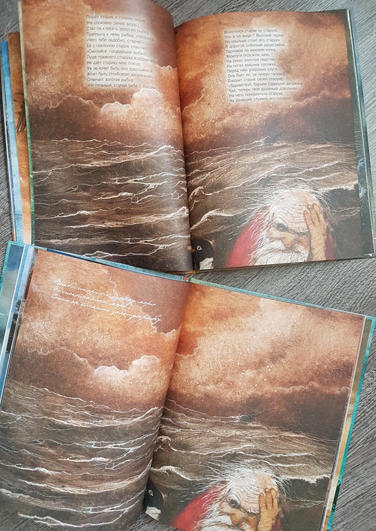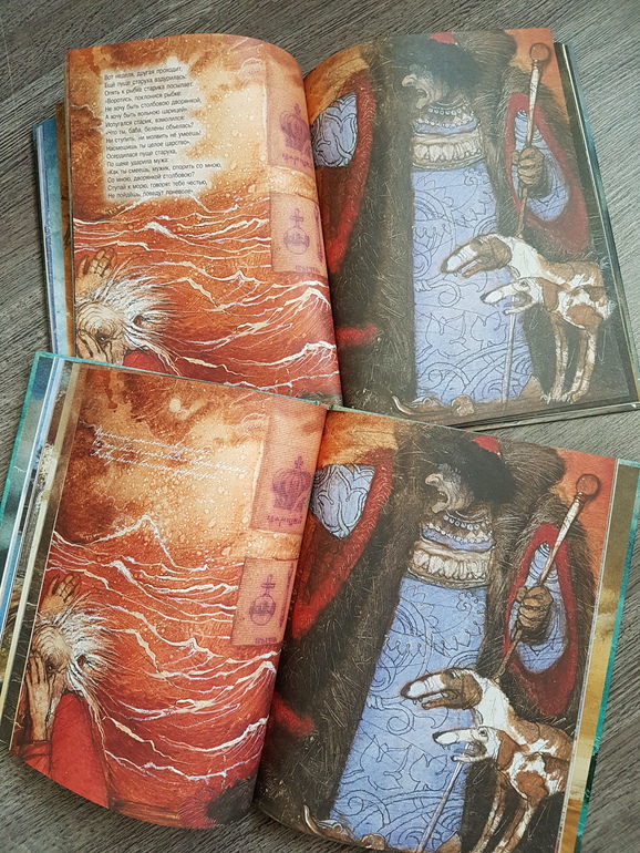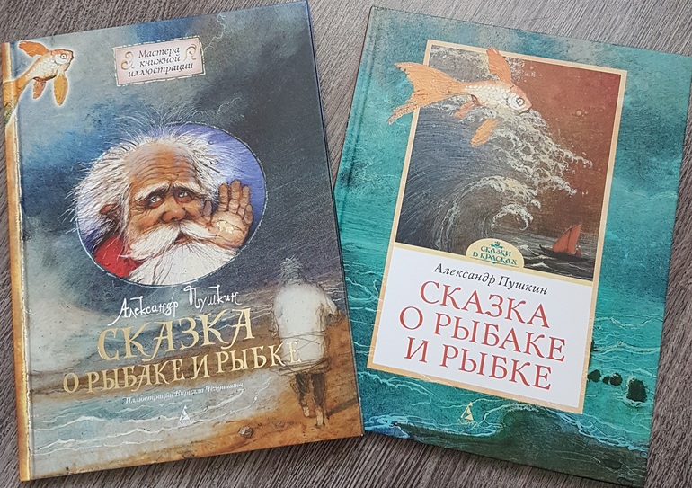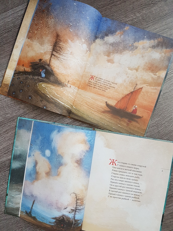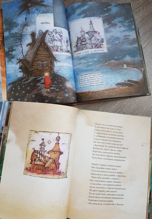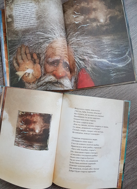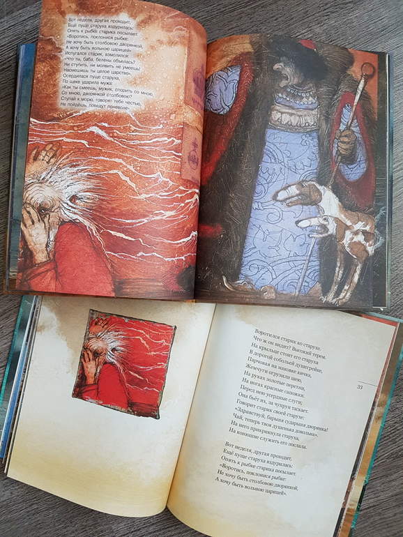 Мне из этой всей истории жалко было всегда рыбку: вляпалась по неосторожности, выкуп предложила, чтоб не сожрали (тут страх, какой там "от чистого сердца"), а они давай ее нещадно эксплуатировать. Дед - тюфяк и подкаблучник, слова поперек бабки не скажет, все на побегушках у нее. Даже желания своего у него нет. Хата развалилась, корыто дырявое (эх, не рукастый дед!), а ему все на завалинке сидеть. Ни хозяйство поддержать, ни старуху накормить. Силы-то, поди, не иссякли еще, к морю резво бегал. Бабка привыкла командовать. А тут еще и пожить нормально шанс появился - решила воспользоваться... и понесло! Коли дед был-бы хозяйственным, и жили бы по-людски, и не загонялась бы баба. Но тогда и сказки бы не было.))) Книги красивые.