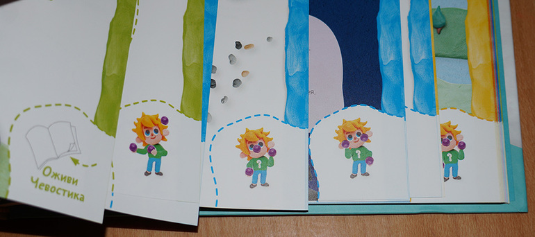 А еще в книге есть маленький сюрприз, называется "оживи Чевостика". При быстром и равномерном перелистывании страниц, небольшая пластилиновая фигурка главного героя, нарисованная в углу странички, будет ловко жонглировать пластилиновыми шариками.
