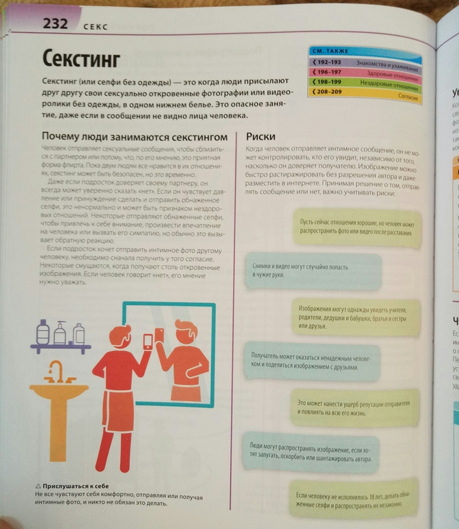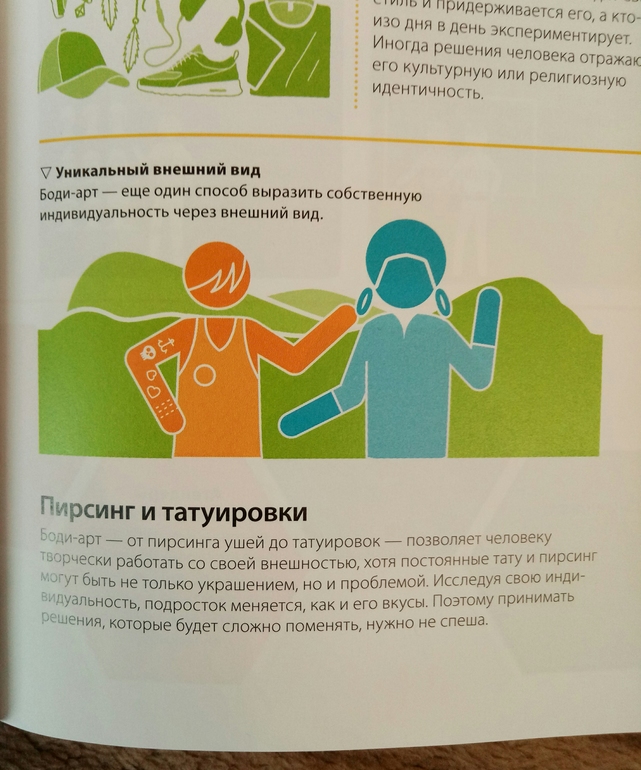 Еще для порадовали главы о физиологическом развитии мальчиков и девочек, и если с девочками мне все таки все ближе и понятнее, то то, что происходит с мальчиками для меня был темный лес... а тут все доступно, понятно, и не обязательно я буду об этом говорить, возможно, эти вопросы он обсудить с папой, но знать мне это не помешает.. вот например, я никогда не задумывалась, как мальчишки переживают ломку голоса, ну меняется голос, что тут такого, а оказывается, они порой очень переживают и смущаются по этому поводу..
