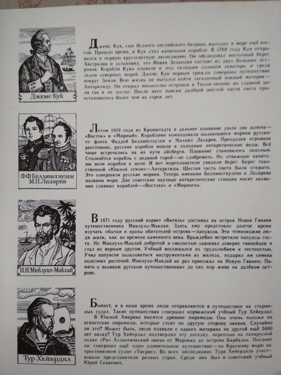 Хоть текста там мало, но она способна пробудить живейший интерес к теме, настолько она красивая. Вся информация о великих путешественниках и их важнейших заслугах даётся на первом развороте, временной охват - 500 лет, от Колумба до современника Хейердала (ну почти современника, если быть точной - всё-таки книге скоро 30 лет стукнет).