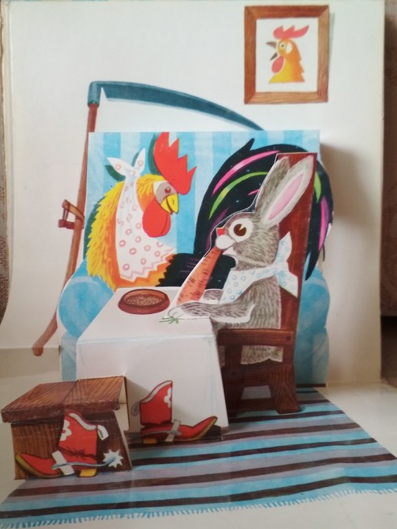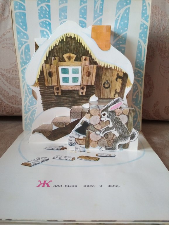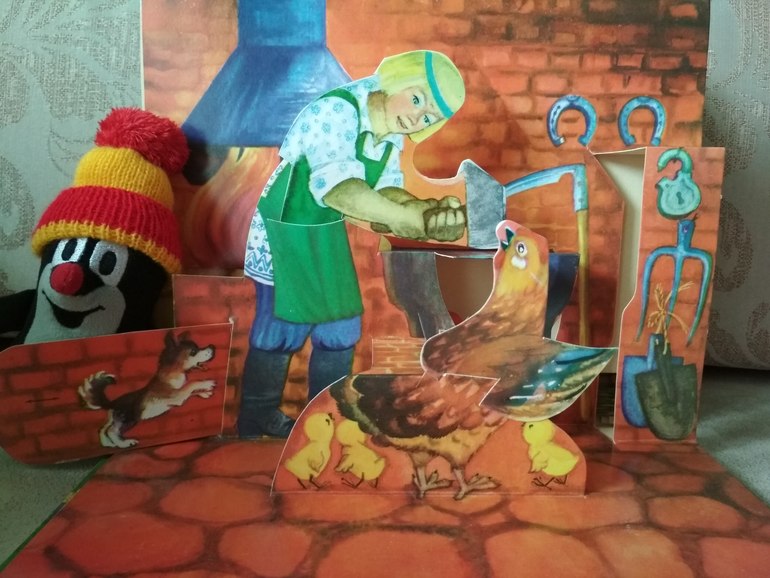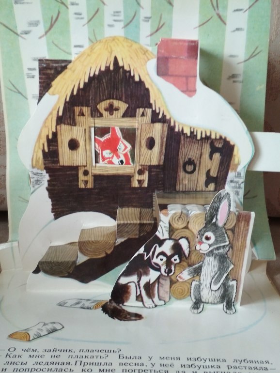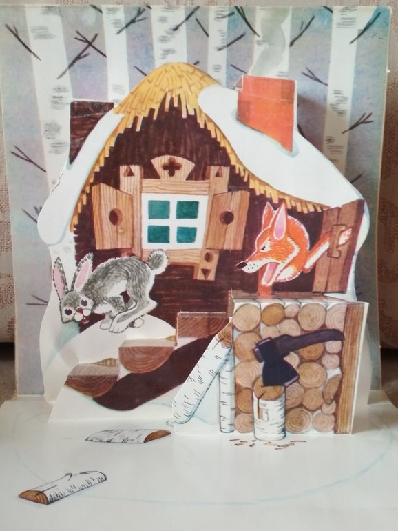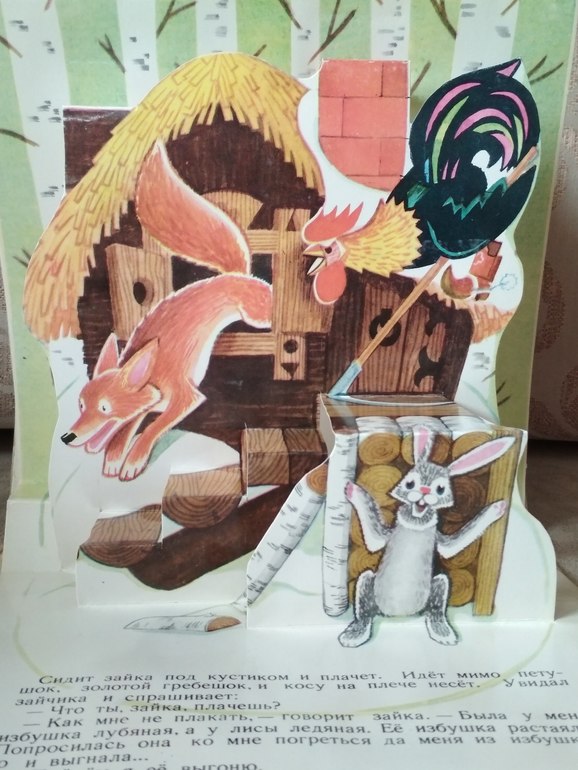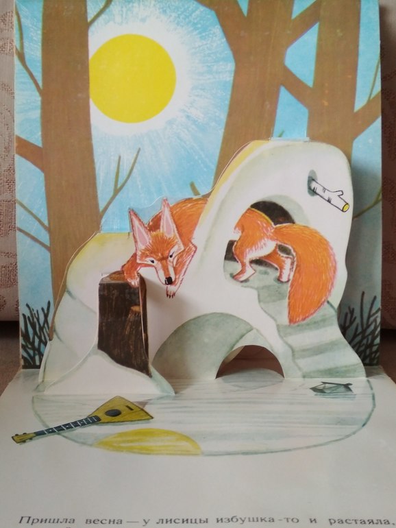 Единственный движущийся элемент - лиса в окошке на двух разворотах, её реплика про клочки по закоулочкам обязательно сопровождается демонстрацией сердитой мордочки.