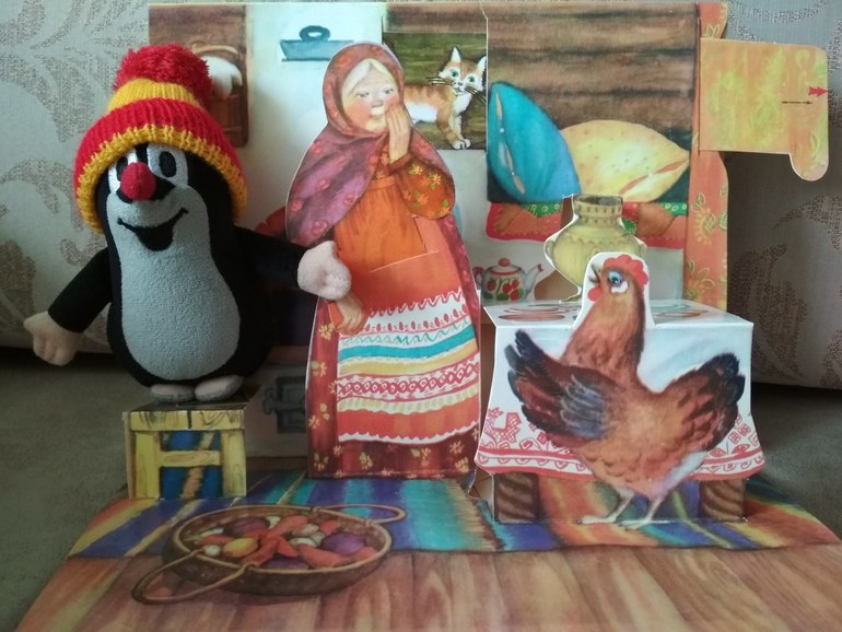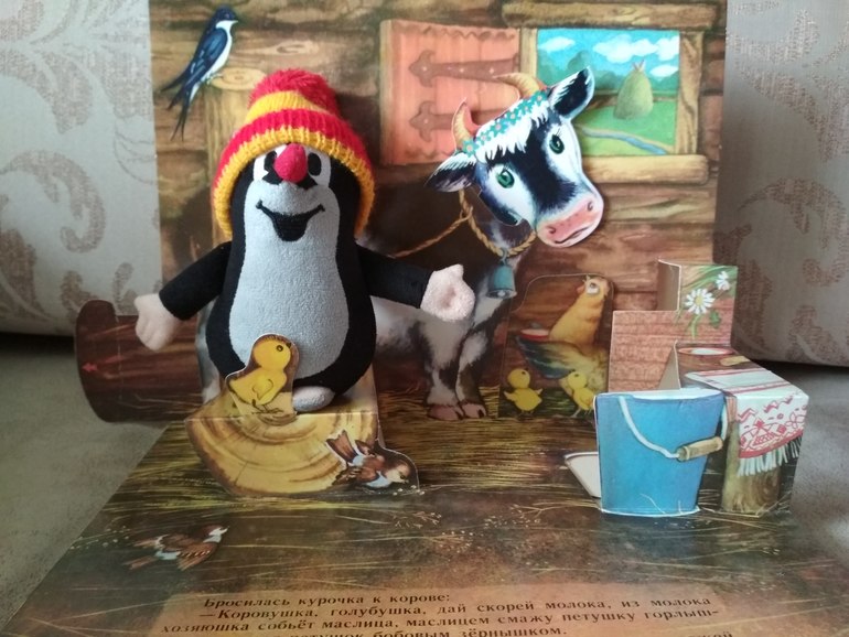 Сама сказка короче всех имеющихся у нас вариантов - тут нет ни волка, ни быка, но это не важно - текст конечно в этой книге вторичен. Главное - чудесные избушки и ступеньки, где даже поиграть можно - фигурками или просто пальчиками.