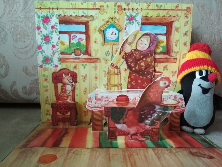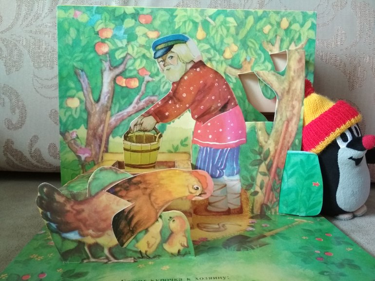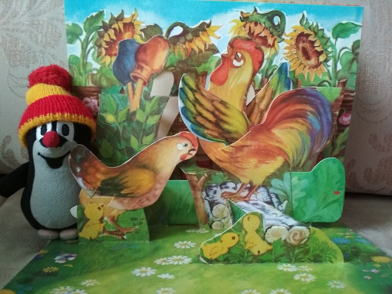 Всем известная сказка о неслухе-петушке и его ответственной сестрице. В этой книге на каждой странице кроме объемной картинки есть ещё и небольшой интерактив - например, так заманчиво привести в действие петушка, который клюёт зернышки