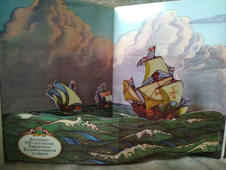 Мне больше всего нравится разворот с испанским городом 16 века - тут полный эффект присутствия, будто сам стоишь среди толпы и с высоты смотришь на город и причаливший корабль.