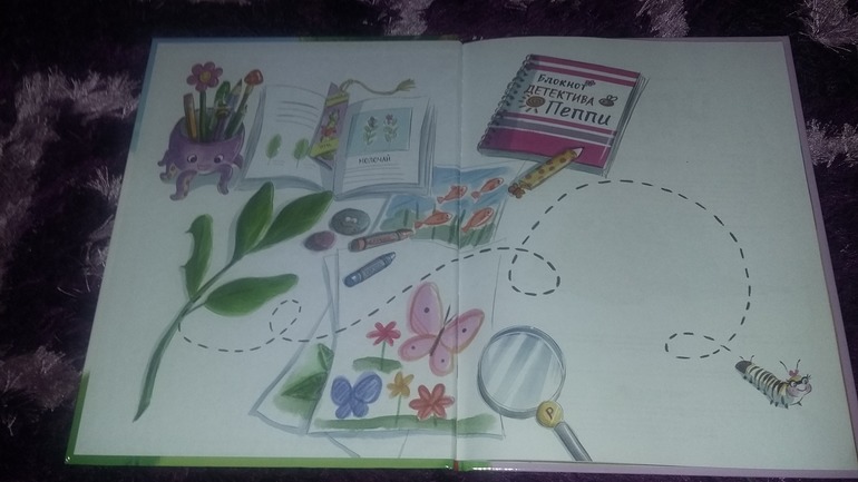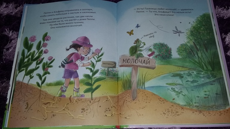 В первой книге в дом Пеппи приходит маленькая симпатичная гусеница с ямочками на щечках) А через несколько дней она исчезает, и Пеппи с Альфредом отправляются на ее поиски... Все заканчивается хорошо) Расследование закончено, дело закрыто. Оказывается, гусеницы бабочки Махаон едят только молочай, а для некоторых других он опасен и ядовит. Я не знала, и, признаюсь, никогда не видела молочай)