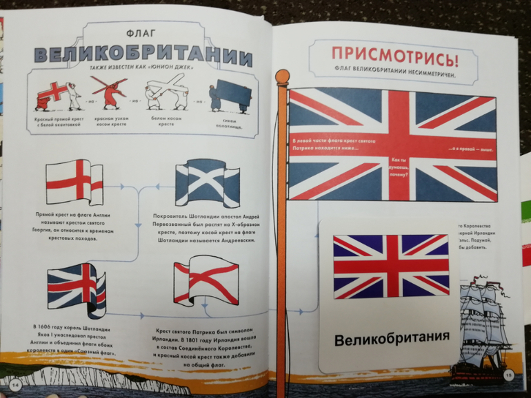 Для сравнения, на фото информация о флаге Великобритании, а если быть более точной о его названии - "Юнион Джек" на карточке Умница и в энциклопедии "Флаги":