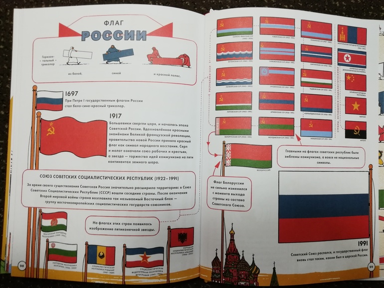 Второй раздел с трехполосными флагами меня удивил. Мы не обнаружили в нем флаг России, дети очень расстроились. Но когда мы дочитали до раздела Красно-бело-синие флаги, мы с радостью обнаружили в нем не только флаг нашей страны (которому кстати посвящен отдельный разворот книги), но и много других государственных флагов, похожих на наш! Я например не знала, что при Петре Первом флаг России выглядел точно так же, как и сейчас. Детям понравилось, что помимо флага России, есть еще информация про флаг СССР, а так же изображения всех флагов Республик СССР. Стоит ли говорить, что этот разворот стал любимым у детей!?