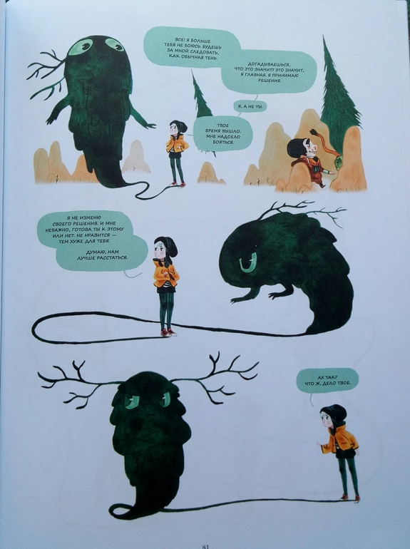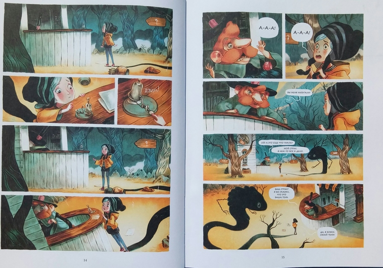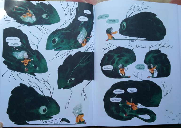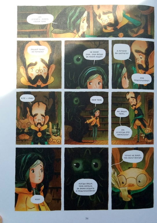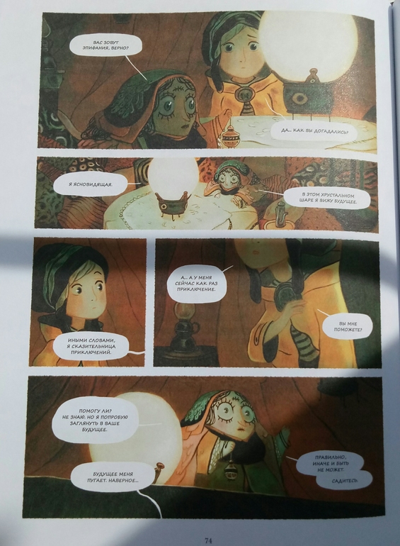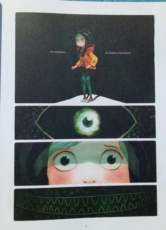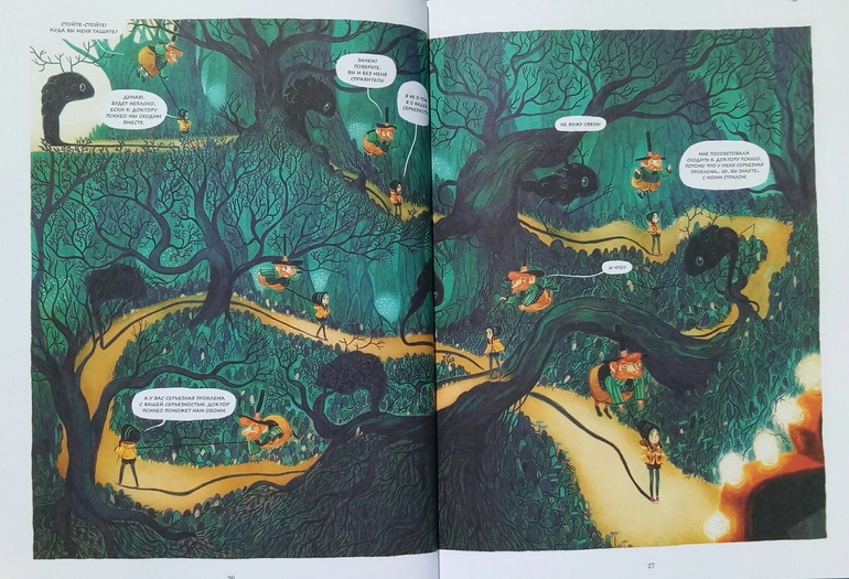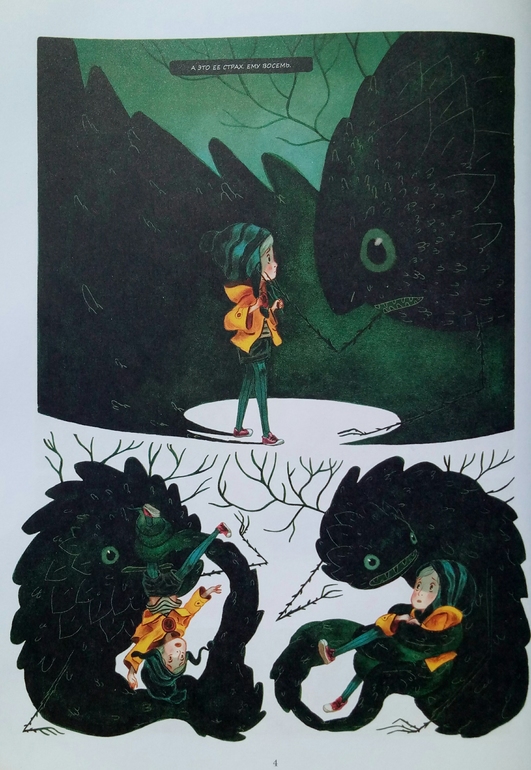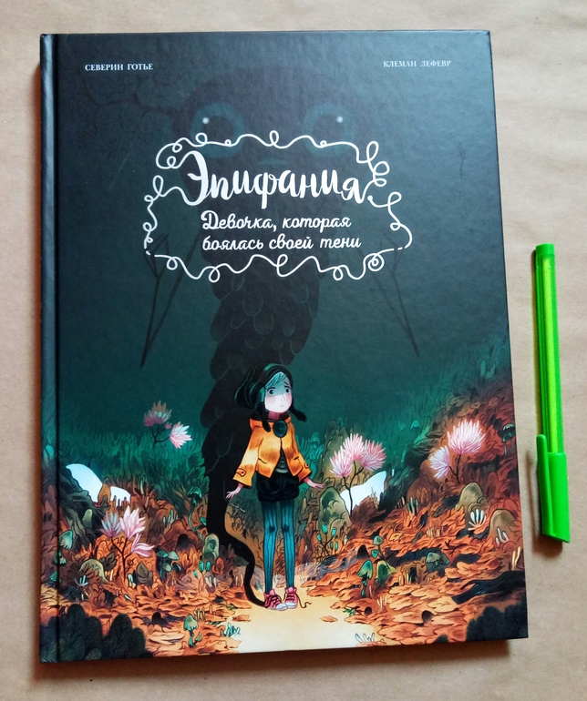 Отдельно хочу сказать про иллюстрации Клемана Лефевр! Они такие классные ! Теплые, душевные, очень красивые, спокойные, сочетание теплых желто- оранжевых и темных цветов делает эту книгу более доброй и позитивной! А черный вообще то оказадся темно-темно- зеленым. Я вот вообще не планировала их читать, думала это какой нибудь животрепещущий триллер , тяжелый и драматичный, а увидела рисунки, и поняла, триллер не может быть с такими светлыми и добрыми рисунками! И книжка очень светлая! И возможно действительно, если Ваш ребенок чего то боится, стоит обратить внимание на эту книгу и вместе с Эпифанией заглянуть в глаза своему страху и сказать Кышь!)