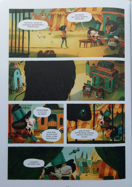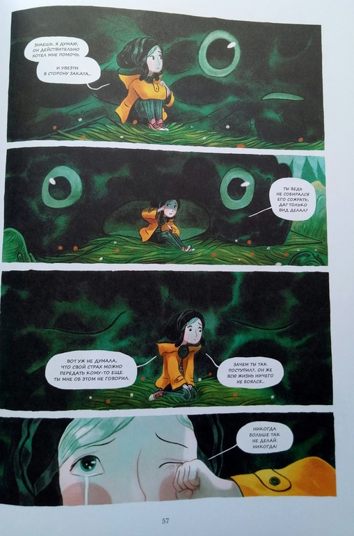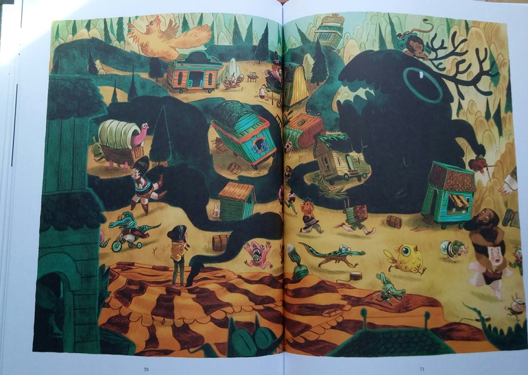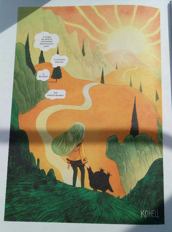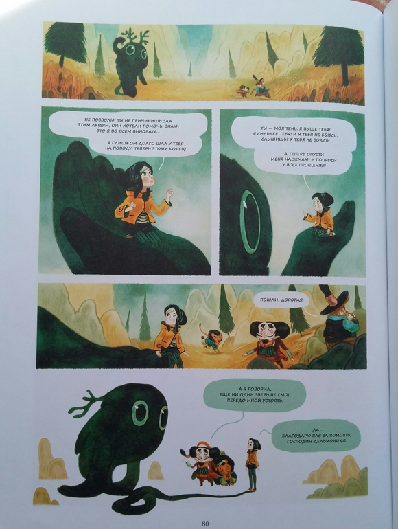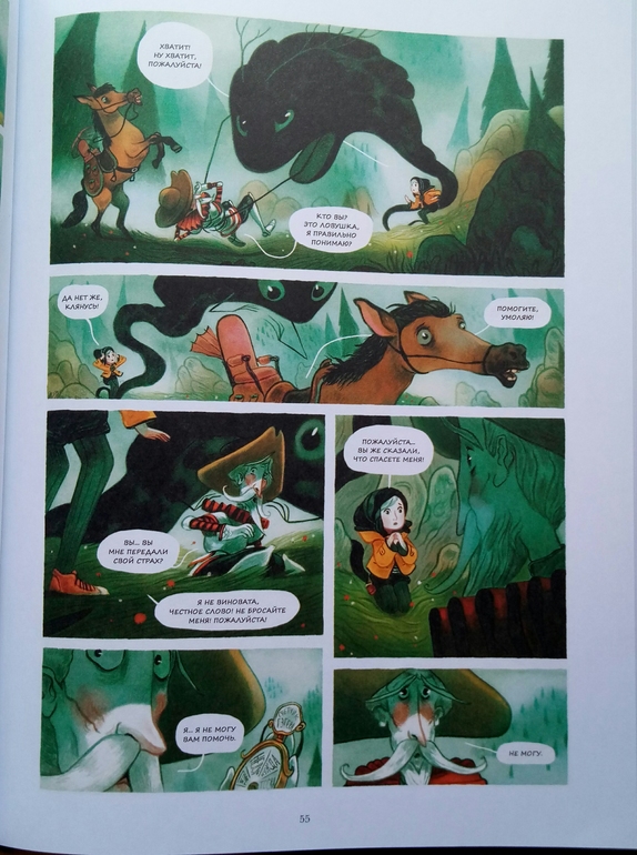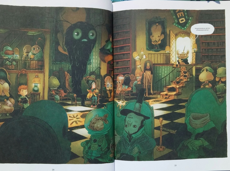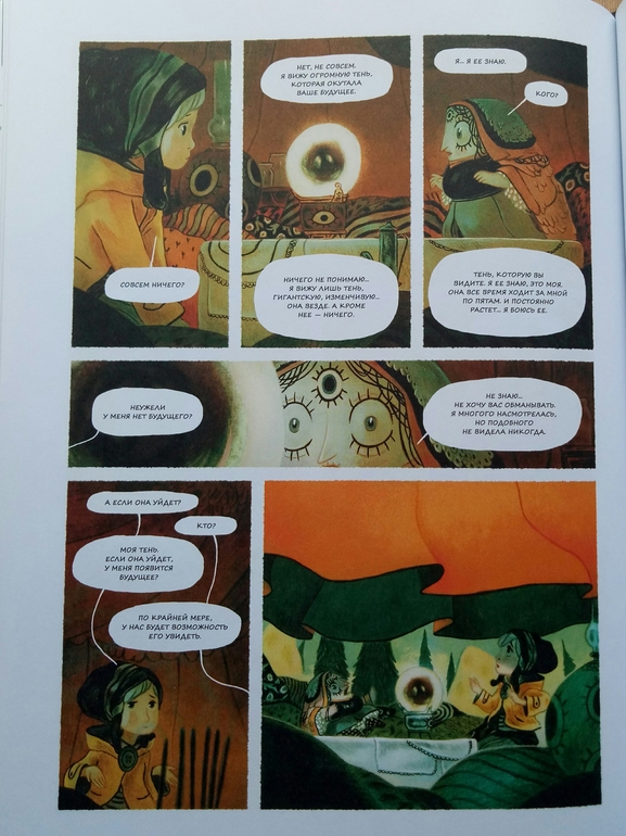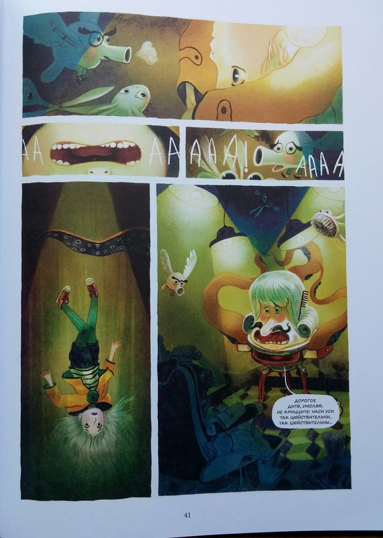 Отдельно хочу сказать про иллюстрации Клемана Лефевр! Они такие классные ! Теплые, душевные, очень красивые, спокойные, сочетание теплых желто- оранжевых и темных цветов делает эту книгу более доброй и позитивной! А черный вообще то оказадся темно-темно- зеленым. Я вот вообще не планировала их читать, думала это какой нибудь животрепещущий триллер , тяжелый и драматичный, а увидела рисунки, и поняла, триллер не может быть с такими светлыми и добрыми рисунками! И книжка очень светлая! И возможно действительно, если Ваш ребенок чего то боится, стоит обратить внимание на эту книгу и вместе с Эпифанией заглянуть в глаза своему страху и сказать Кышь!)
