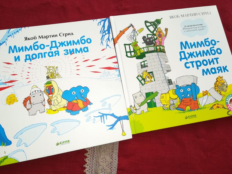 Опять же Клевер. Мимбо-Джимбо и долгая зима и Мимбо-Джимбо строит маяк. Хотя остальные книги про слоненка Илья любит, но эти я сознательно отложила, не читая ему, так как текста в них больше, воспринимается он сложнее. Но Мимбо все также отжигает))