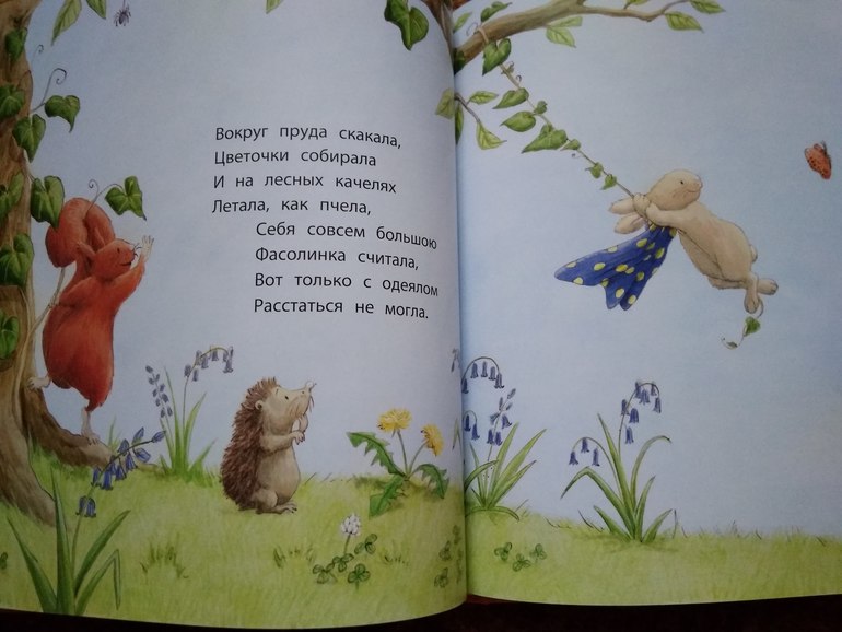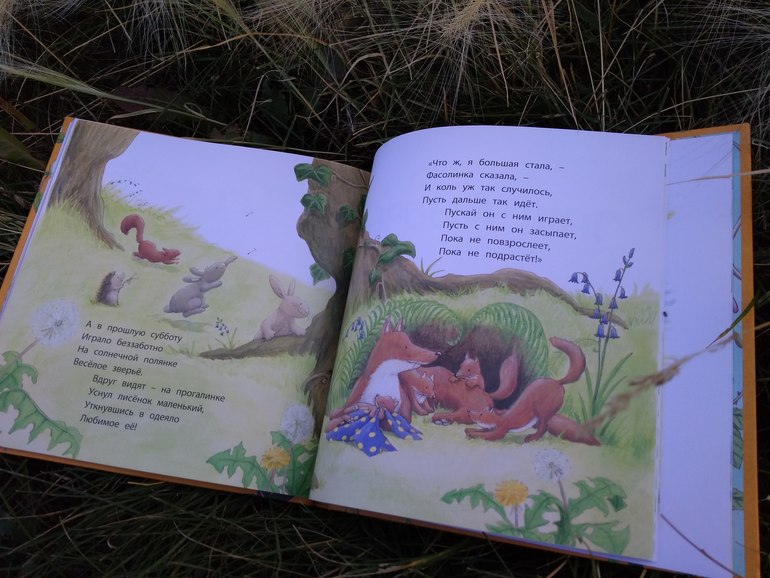 А когда одеяльце все же нашел и уснул, уткнувшись в него маленький лисенок, Фасолинка великодушно подарила его малышу. Ведь она уже большая!