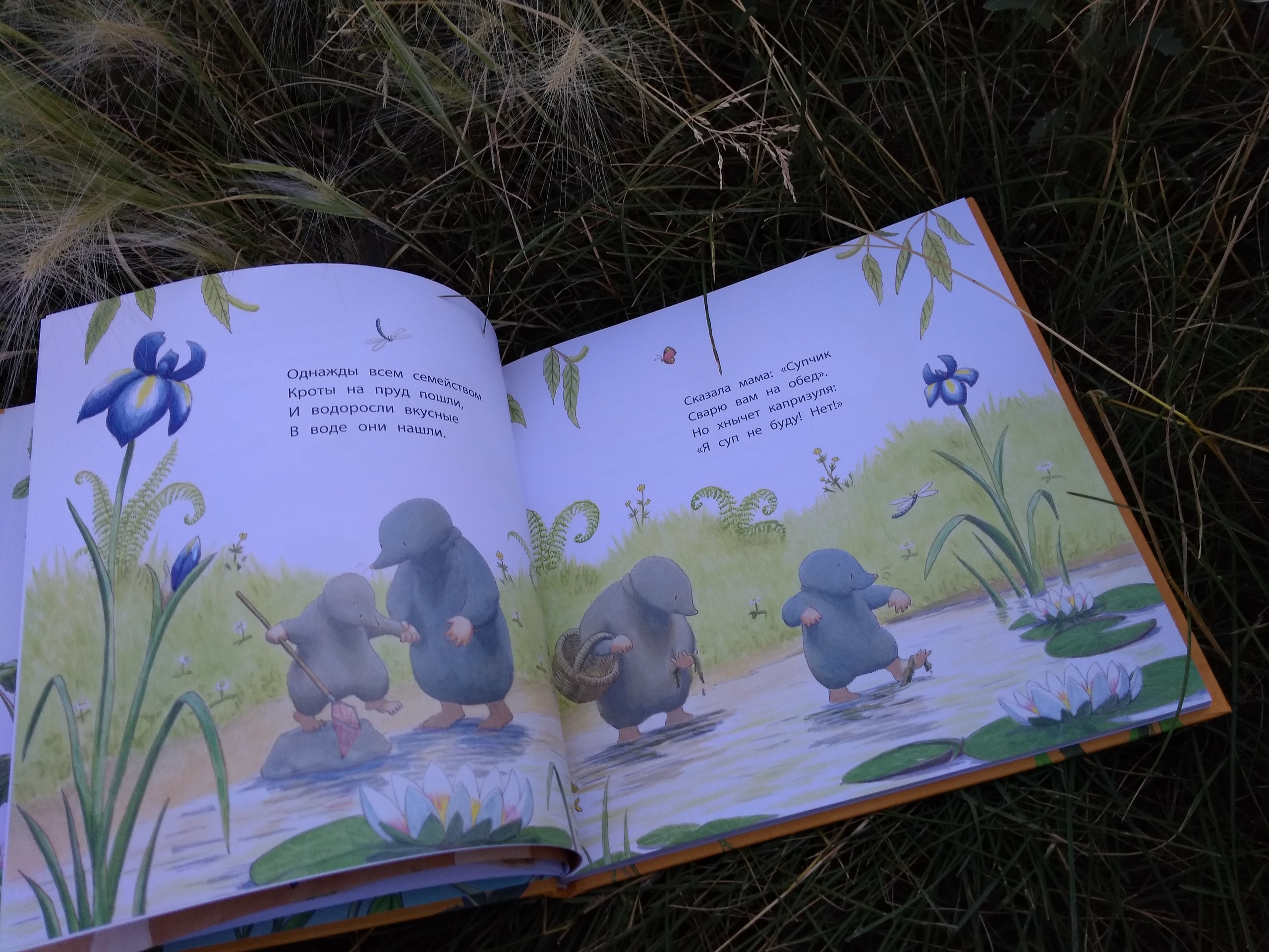 В первой истории героиня - капризная дочка в семействе кротов по имени Ежевичка. Рифмы соответствующие - сестрички-Ежевичка, Веточка-деточки , лапки-тарелочки-кустики-пригорочки и прочая милота.