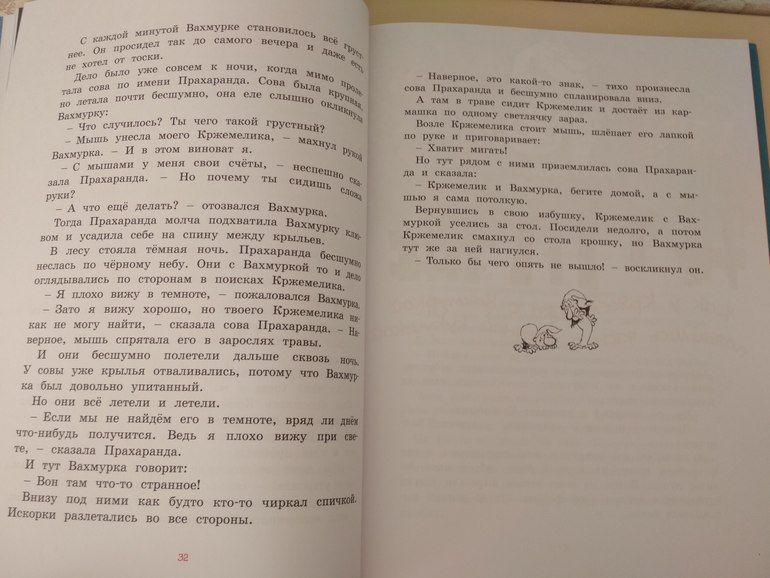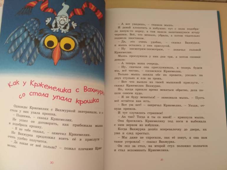 Кржемелик и Вахмурка покупались наугад. В книге коротенькие рассказы (как я поняла, совпадают с одноименными мультфильмами). Иллюстрация одна в начале рассказа, далее идет разворот без картинок. И на этом история заканчивается. И так в каждом рассказе, которых я насчитала 33.