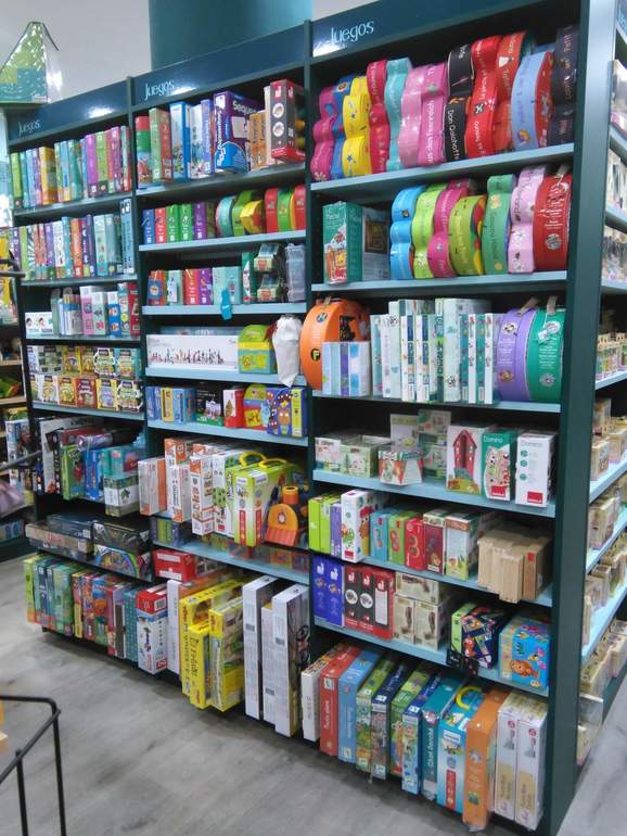 Стеллаж с фигурными пазлами и играми.Конечно я не хочу сказать ,что мне не нравится классика и т.д У меня вызывают восторг многочисленные книжные "коридоры", например в нашей Самарской "Чаконе".(Девочкам из Самары тоже привет!!!).Идешь там ,как по библиотеке им.Ленина ,а книги все не кончаются...на любые темы тебе пожалуйста .Но для детей мне нравится такой вот "испанский" формат. Хотя взрослые книги в этом магазине тоже есть. Все расположено на стеллажах,стеллажиках,полочках ,столиках...куда не повернись уткнешься в книгу :)