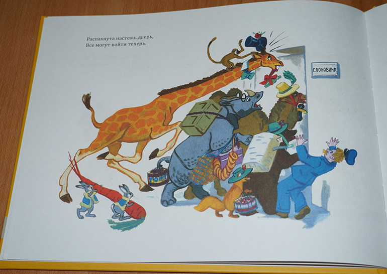 И все звери отправились в слоновий дом в гости, с подарками. Ажиотаж, толкотня и давка.