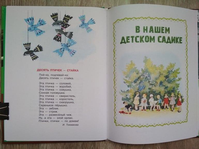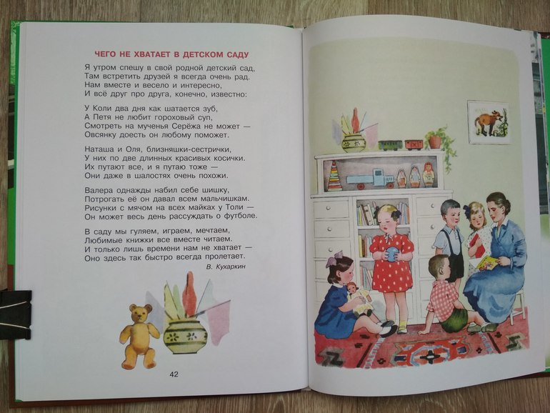 А вот раздел про детский сад наоборот дополнили "шедеврами" современных авторов. Помните, этих самых и др. - их тут в процентном соотношении приблизительно 50%, о чём в описании скромно умолчали. На одной странице соседствуют рифмовки о пользе детского сада(молока, манной каши) и настоящая детская поэзия, что создаёт диссонанс в звучании и тональности этой книги.