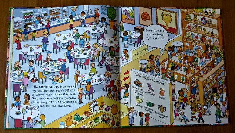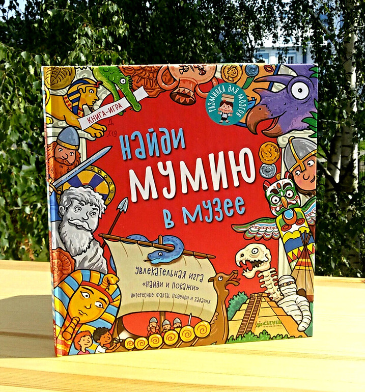 Также на каждом развороте среди людей, экспонатов и вещей спряталась хитрая мумия, которую тоже надо найти. Иногда это оказывается достаточно сложно. В некоторых заданиях дети просили поискать вместе с ними.