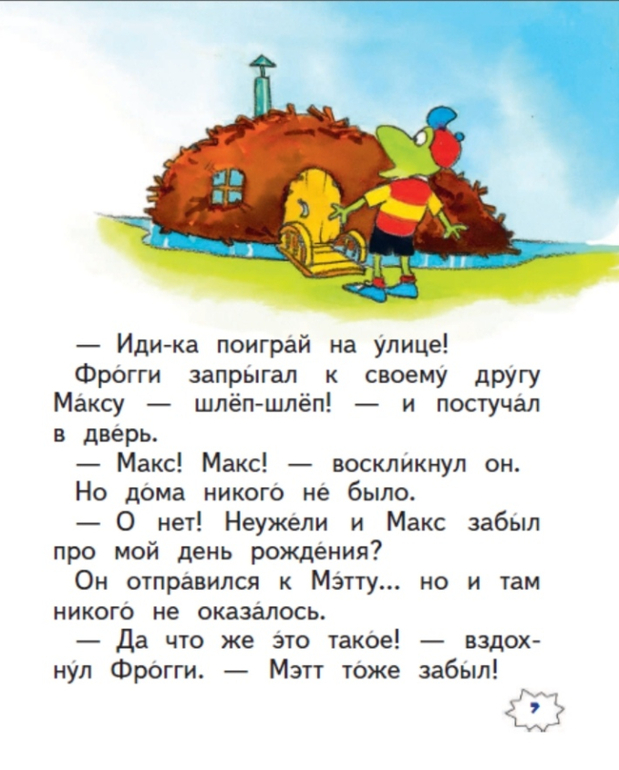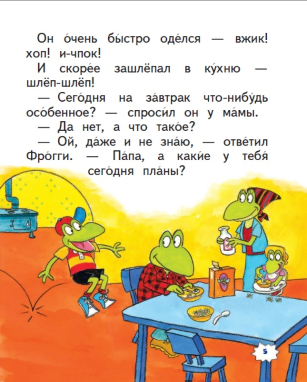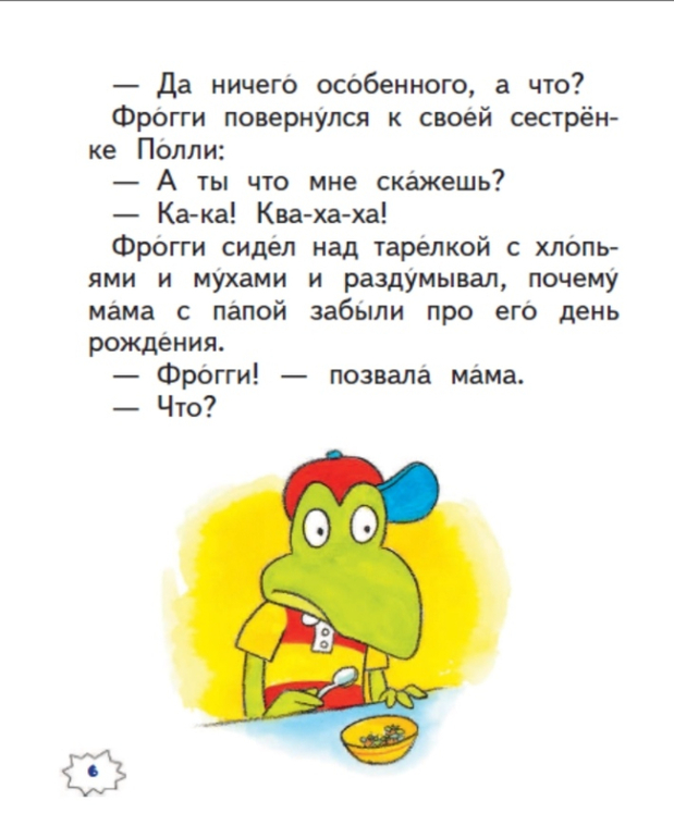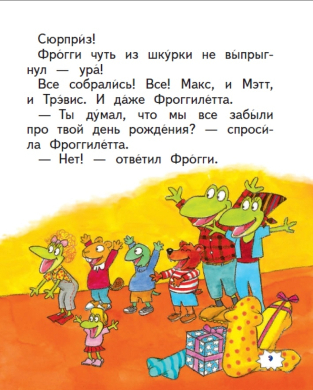 В книгу вошло шесть смешных историй американского писателя Джонатана Лондона про маленького лягушонка-непоседу. Как и многим малышам, Фрогги очень трудно усидеть на месте и вести себя тихо. Он любит прыгать, громко петь песенки, даже когда находится в библиотеке или на школьном уроке. Еще иногда Фрогги забывает умыться и никак не может найти свою зубную щетку.