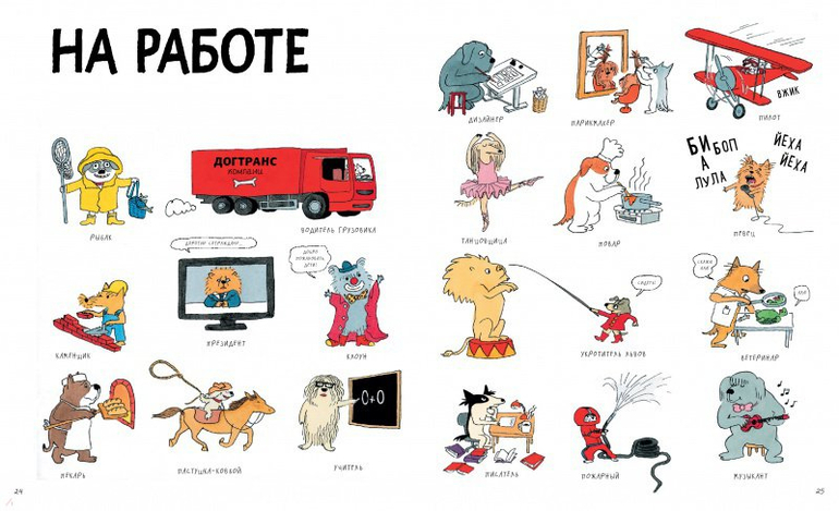 Эту необычную книгу создала Доротея де Монфре, современный французский иллюстратор и автор детских книг. Её рисунки, лёгкие и забавные, выполнены в лучших традициях известного иллюстратора Ричарда Скарри, чьими работами вдохновляется Доротея. Эта книга откроет читателю весёлый мир собак, который мало чем отличается от нашего. Неугомонные собаки тоже ходят в школу и супермаркет, готовят обед и занимаются спортом. Книга будет интересна читателям разных уровней подготовки: от тех, кто только начинает читать, до младших школьников, а также всем любителям собак.