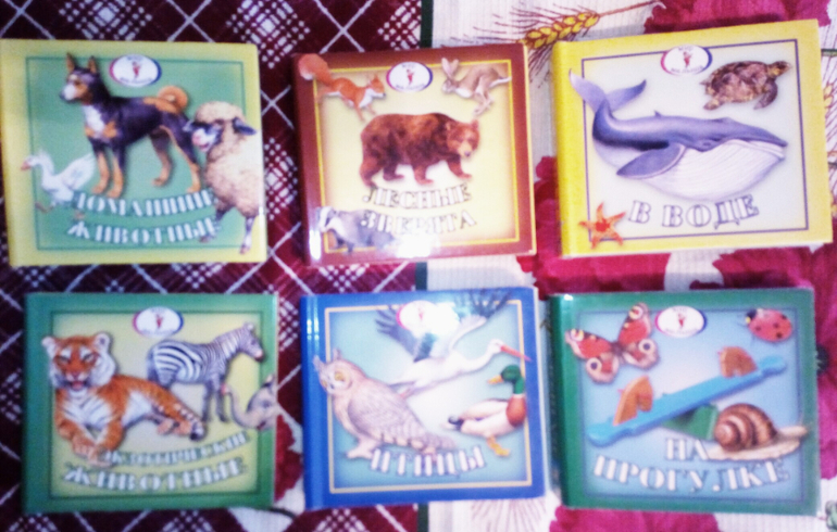 Эти книжки-раскладушки или ширмочки лежат у нас там,где и малютки,поэтому и о них пара слов.Конечно,с их приобретеним я запоздала.и в них уже не играем,а читать там нечего.Так младшие "пыкали" слова.Теперь только если в сочинение историй можем поиграть.Пусть лежат до внуков))